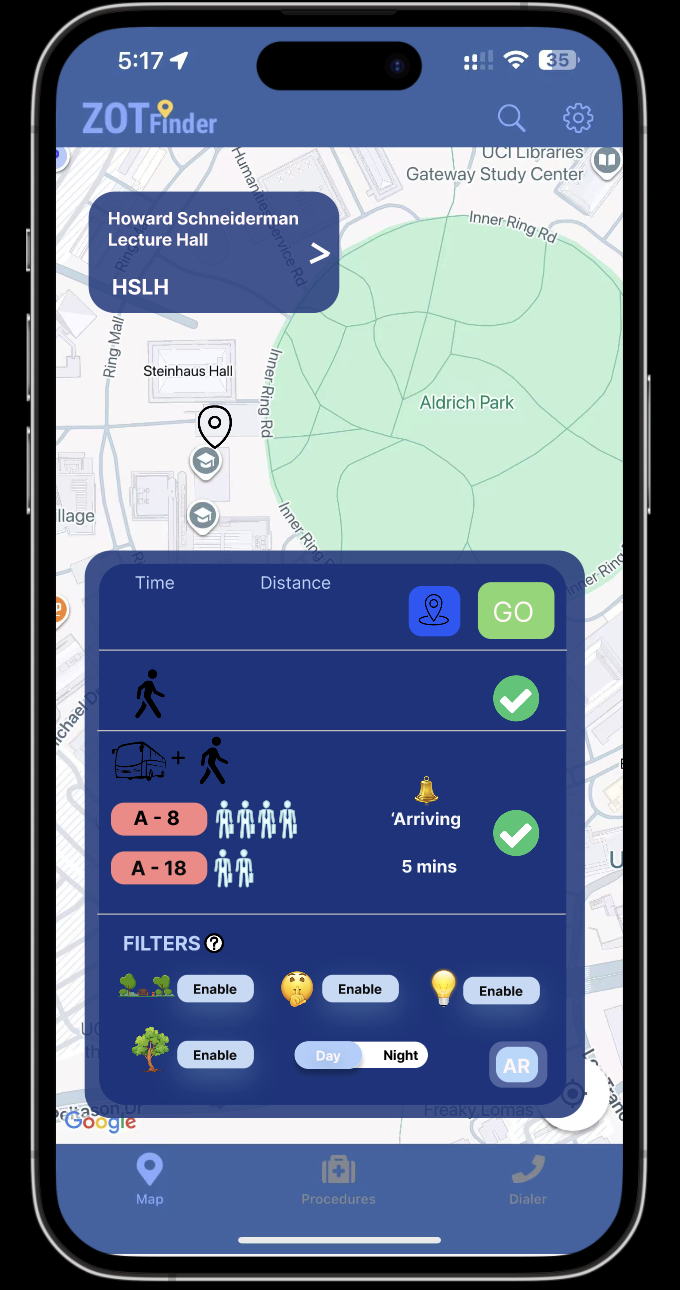Both participants were fourth year UCI undergraduate students who live off campus and commute regularly, but they came to the evaluation with different levels of experience using ZotFinder and transit apps. The first participant was an experienced ZotFinder user and had also used TransLoc before. She quickly understood the basic structure of the redesigned interface and moved through the tasks with relatively little hesitation. When asked to plan a route, she chose to walk to Howard Schneiderman Lecture Hall and used the filters to remove routes she did not want. She described the filters as a way to “filter out the routes I do not want,” and she was able to apply conditions such as avoiding certain areas and then select the remaining route that fit her schedule and comfort level. She relied on the time and distance information on the route cards to understand the overall trip duration and liked that she could compare options without doing extra calculations. In the bus section, she used the times and crowd icons to judge that the first bus looked quite full and that she did not have enough time to wait for a later one, so she decided to walk instead. She said she liked having bus information in the interface and found the small person icons clear and visually appealing. At the same time, she commented that the Day and Night toggle felt unnecessary because preferences like wanting a well lit or quiet route were already covered by other filters, which made that toggle feel somewhat redundant.